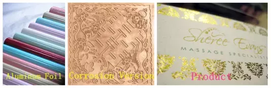 Vid en viss temperatur och tryck överför aluminiumfolien till produktytan, olika mönster och ord med olika zink- eller kopparkorrosionsversion.